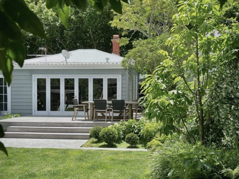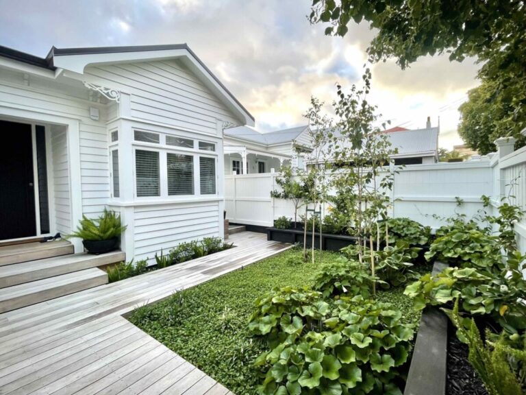 A family backyard has undergone a total planting redesign in a classic green and white palette