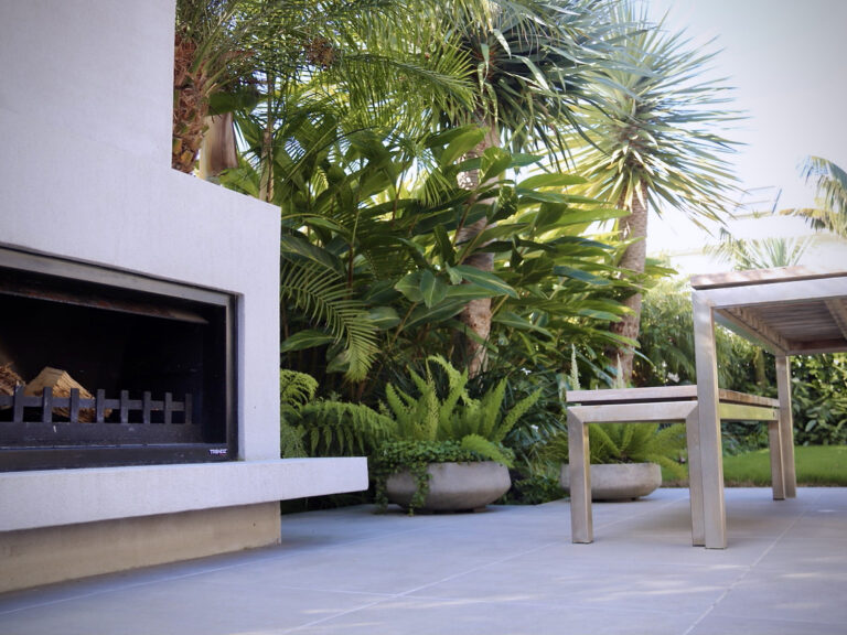 Generous outdoor entertaining spaces flow from the home to connect with a verdant subtropical garden.
