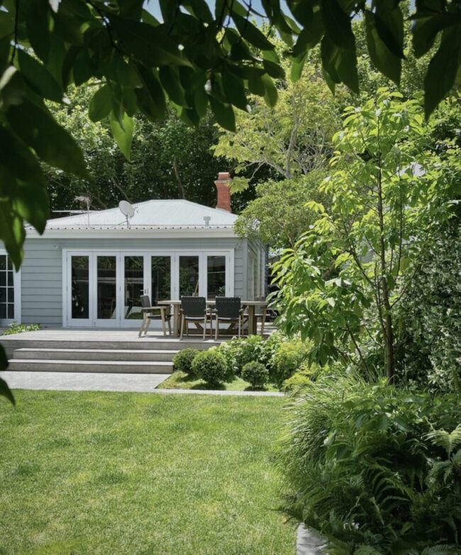 A family backyard has undergone a total planting redesign in a classic green and white palette