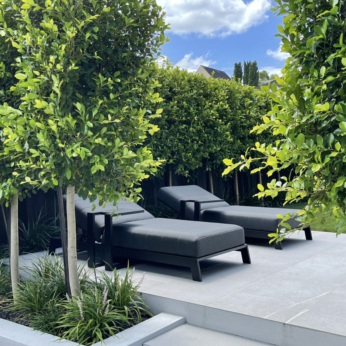This large, contemporary home called for a garden that extended its clean lines and modern aesthetic into the outdoor space, creating an inviting environment for relaxed living and effortless entertaining. – A low-maintenance garden that balanced the scale of the impressive residence while also addressing the privacy challenges inherent in a corner site.