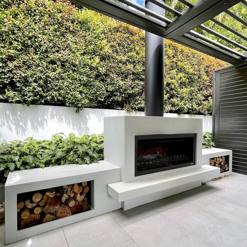 The generous main patio incorporates a sleek, modern louvre roof allowing for year-round enjoyment, while the large outdoor fireplace creates a warm and inviting focal point on cooler evenings.