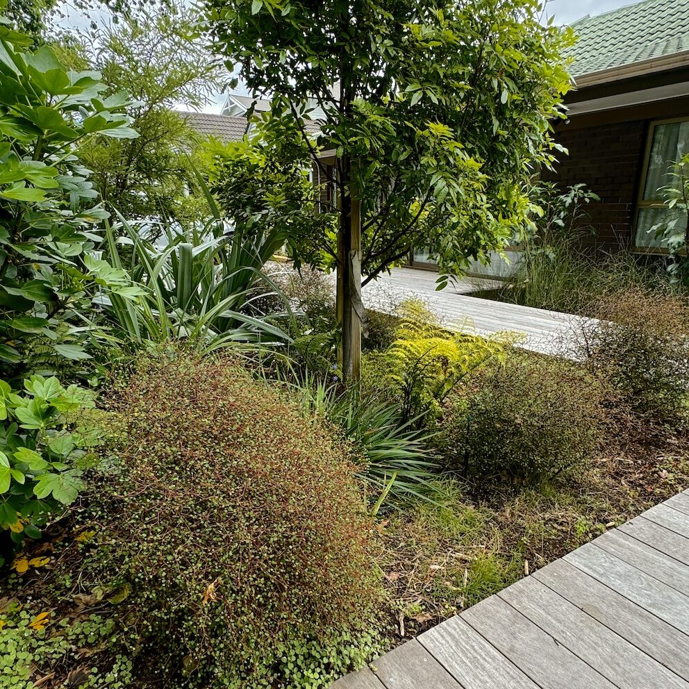 The entirely native planting scheme provides visual interest with minimal upkeep. The diverse textures and colours offer year-round appeal and a connection to the New Zealand landscape, referencing their previous home. The layered planting also creates a natural screen, enhancing privacy from the street and transforming the previously exposed frontage. While the organic forms of the native plants soften the boardwalk and 1980s architecture.
