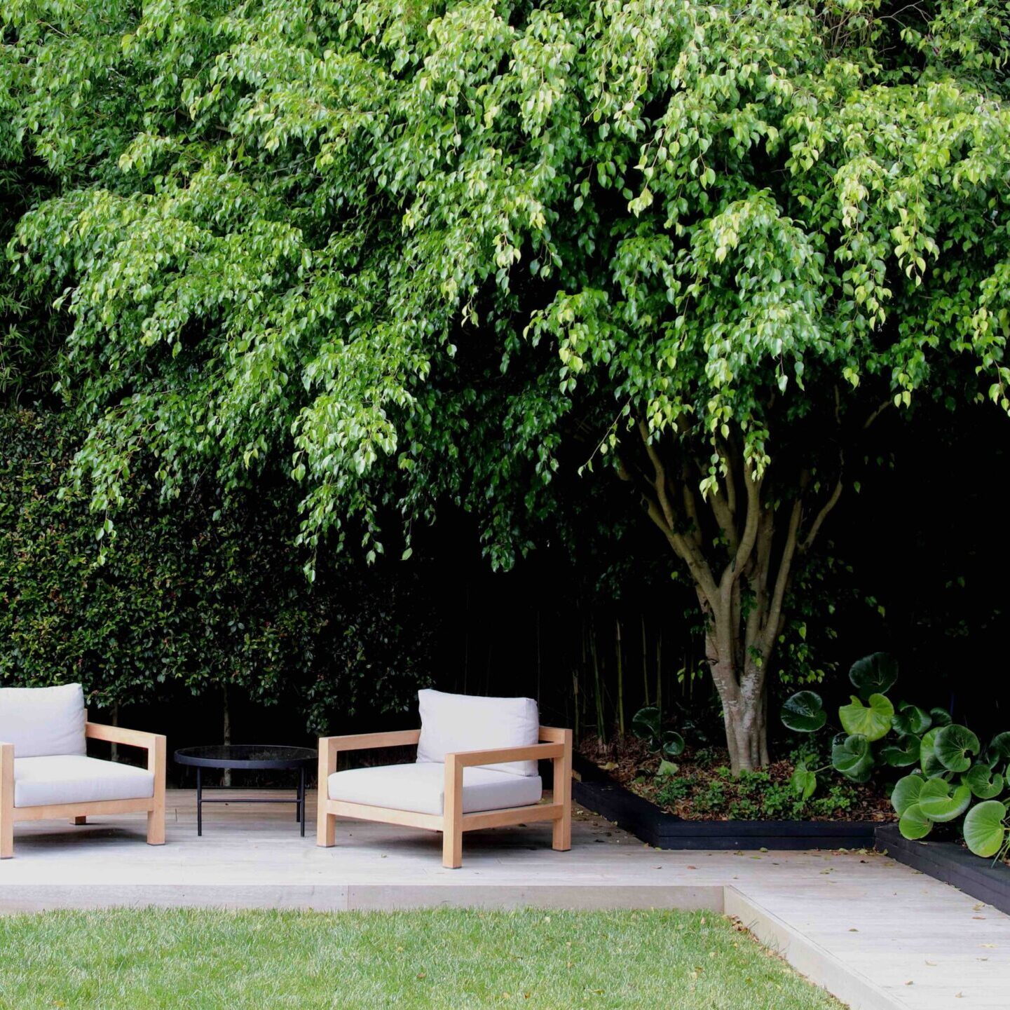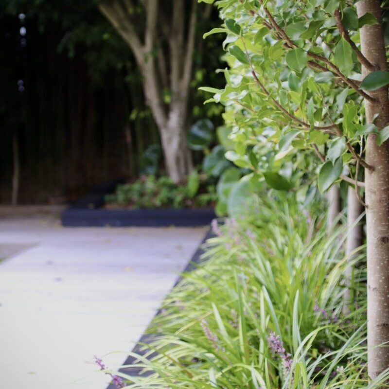 Working with an existing tall screen of bamboo and beautiful mature Ficus Benjamina tree, additional planting was pared back with low textural layers for added interest and tall hedging giving a sense of enclosure.