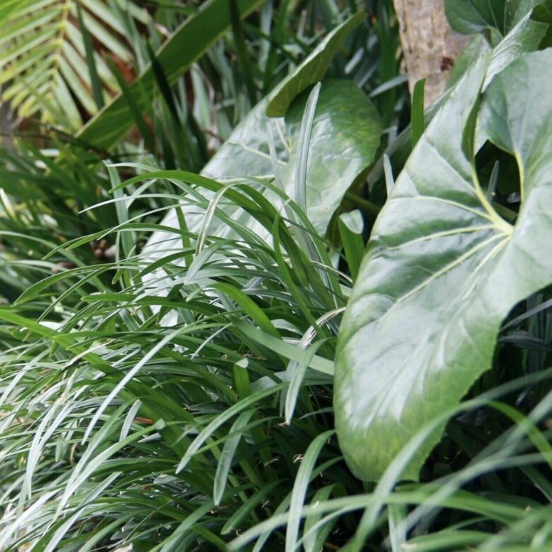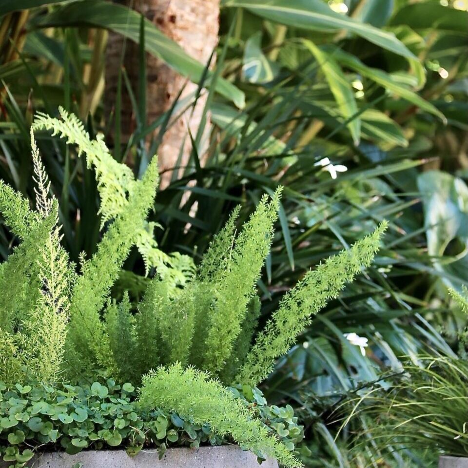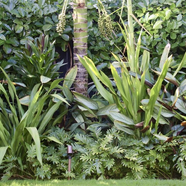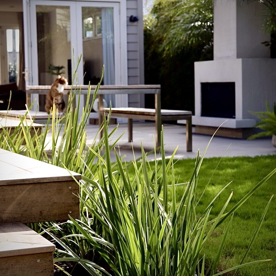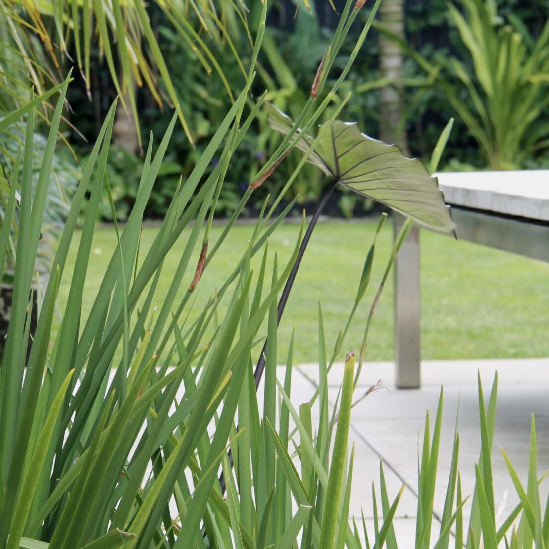 Beyond the entertaining zone a plush lawn is the perfect foil for the surrounding lush planting, making for a secluded retreat.