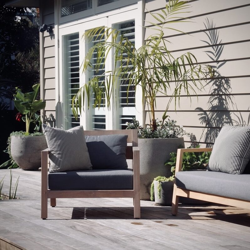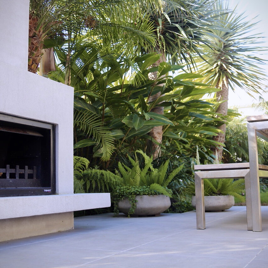 Generous outdoor entertaining spaces flow from the home to connect with a verdant subtropical garden. A split level lounging deck steps down to the dining patio complete with a fireplace.